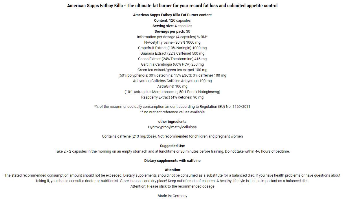 A Fatboy Killa® egy innovatív zsírégető a folyékony táplálékkiegészítők elismert első számú márkájától. Ezt a Németországban kifejlesztett formulát azzal a fő céllal alkották meg, hogy támogassa a zsírégetést és elősegítse a kívánt testsúly elérését. A fő hatóanyagok szinergikusan hatnak az anyagcsere fokozására és a termogenezis stimulálására, ami hatékonyabb zsírégetéshez vezet.
