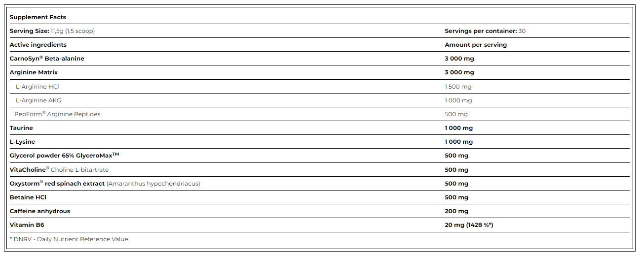 A koffeintartalom stimulálja az idegrendszert, ami fokozott energiához és edzésmotivációhoz vezet. A B6-vitamin fontos szerepet játszik az energia-anyagcserében és segít csökkenteni a fáradtságot. A készítményben található béta-alanin és arginin szintén hozzájárul az állóképesség javításához és az izomregenerálódás optimalizálásához.