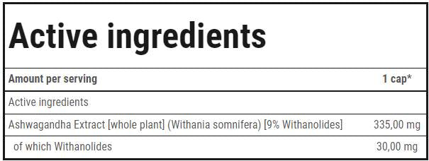 ÖSSZETEVŐK: Ashwagandha kivonat [egész növény] (Withania somnifera) [9% vitanolid] (71,3%); kapszulahéj (zselatin; színezékek – titán-dioxid, vas-oxidok és -hidroxidok, patentkék V); csomósodást gátló anyag – zsírsavak magnéziumsói.