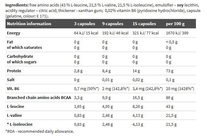 Minden tabletta tartalmaz 1100 milligramm l-izoleucin, l-valin és l-leucin.