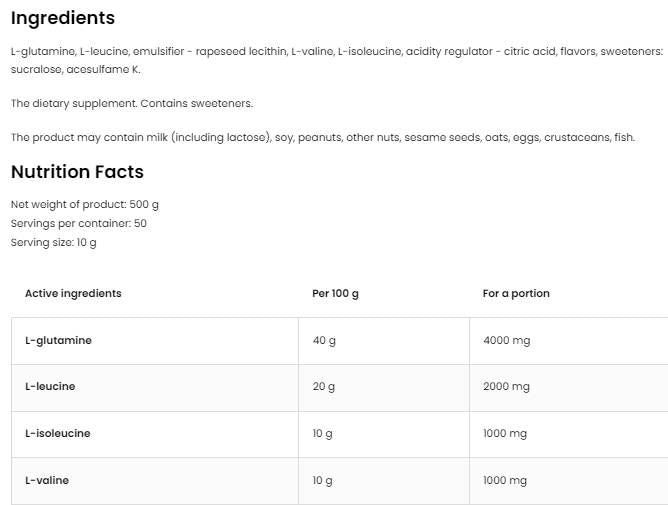 A BCAA-k az esszenciális aminosavak 35%-át teszik ki. Másrészt a glutamin a sportolók körében a legnépszerűbb termékek közé tartozik. Ezért is szerepel ennek az új, forradalmi terméknek a formulájában.