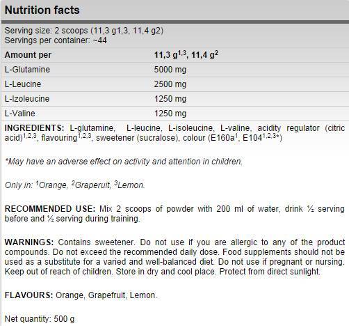 Glutamin - a leggyakoribb aminosav az emberi szervezetben. A glutamin közvetlenül részt vesz az anabolikus folyamatokban, hiánya pedig fáradtsághoz és az izomszövet lebomlásához vezet. A glutamin megakadályozza az izomtömeg elvesztését nehéz edzés, betegség és stressz során. A glutamin sikeresen csökkenti a kortizolszintet is;