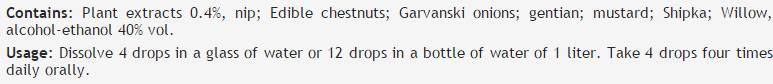 Növényi kivonatok 0,4%: Zsurló; Gesztenye; Hollóhagyma; Tárnics; Mustár; Csipkebogyó; Fűzfa