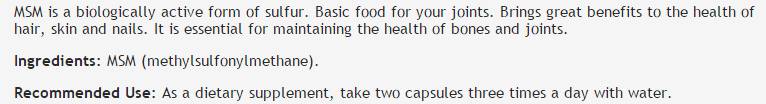Tudományos kutatások szerint az MSM gyulladáscsökkentő hatású lehet, ami jótékony hatással van az ízületi állapotokra, például az osteoarthritisre. Fontos betartani az adagolási ajánlásokat a mellékhatások elkerülése érdekében. Forduljon orvoshoz, ha bármilyen meglévő egészségügyi problémája van, vagy terhes/szoptat.