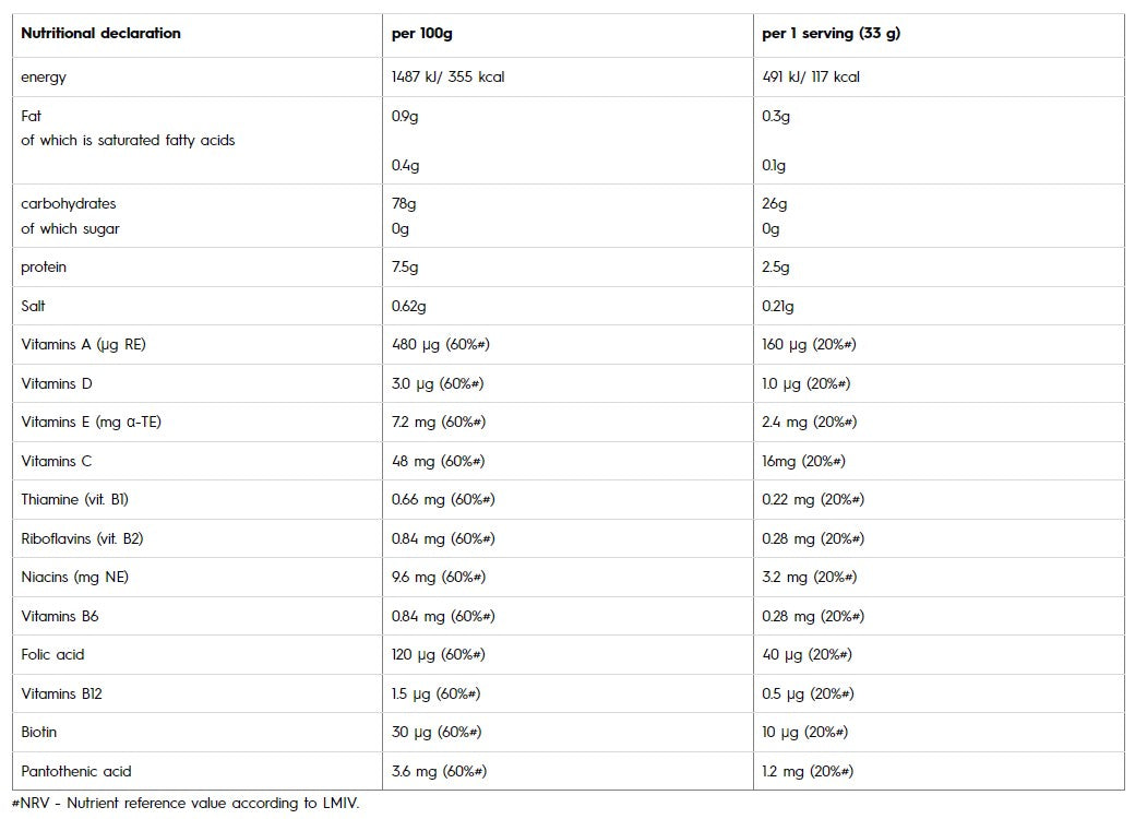 Hozzávalók: 93,5% rizsliszt, 5% alacsony zsírtartalmú kakaópor, édesítőszerek: aceszulfám K, szukralóz; C-, E-, niacin-, A-, B12-, D-, B6-, B2-, B1-vitamin, biotin.
