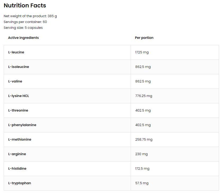 A termék összetétele magában foglalja BCAA komplex , i.ehárom hosszú szénláncú aminosav: leucin, valin és izoleucin, valamint további vegyületek, mint például: lizin, treonin, fenilalanin, metionin, arginin, hisztidin és triptofán.