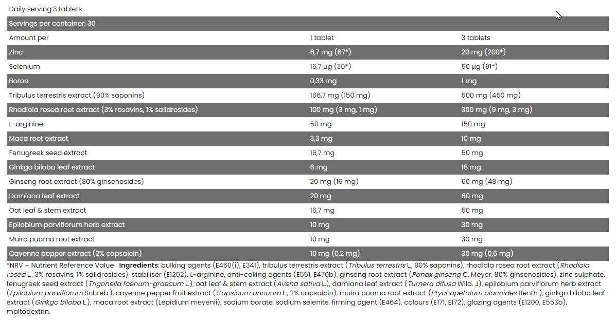 Tesztoszteronfokozó - egy komplex, amely a Tribulus Terrestris, a Damiana és a görögszéna egyedülálló kombinációját tartalmazza. Tartalmazza továbbá a "szabad" tesztoszteron erős stimulátorát - az Avena Sativa-t. Nem szabad alábecsülni a cink és a bór ásványi anyagok szerepét, amelyek szintén részt vesznek a tesztoszteron szintézisében;