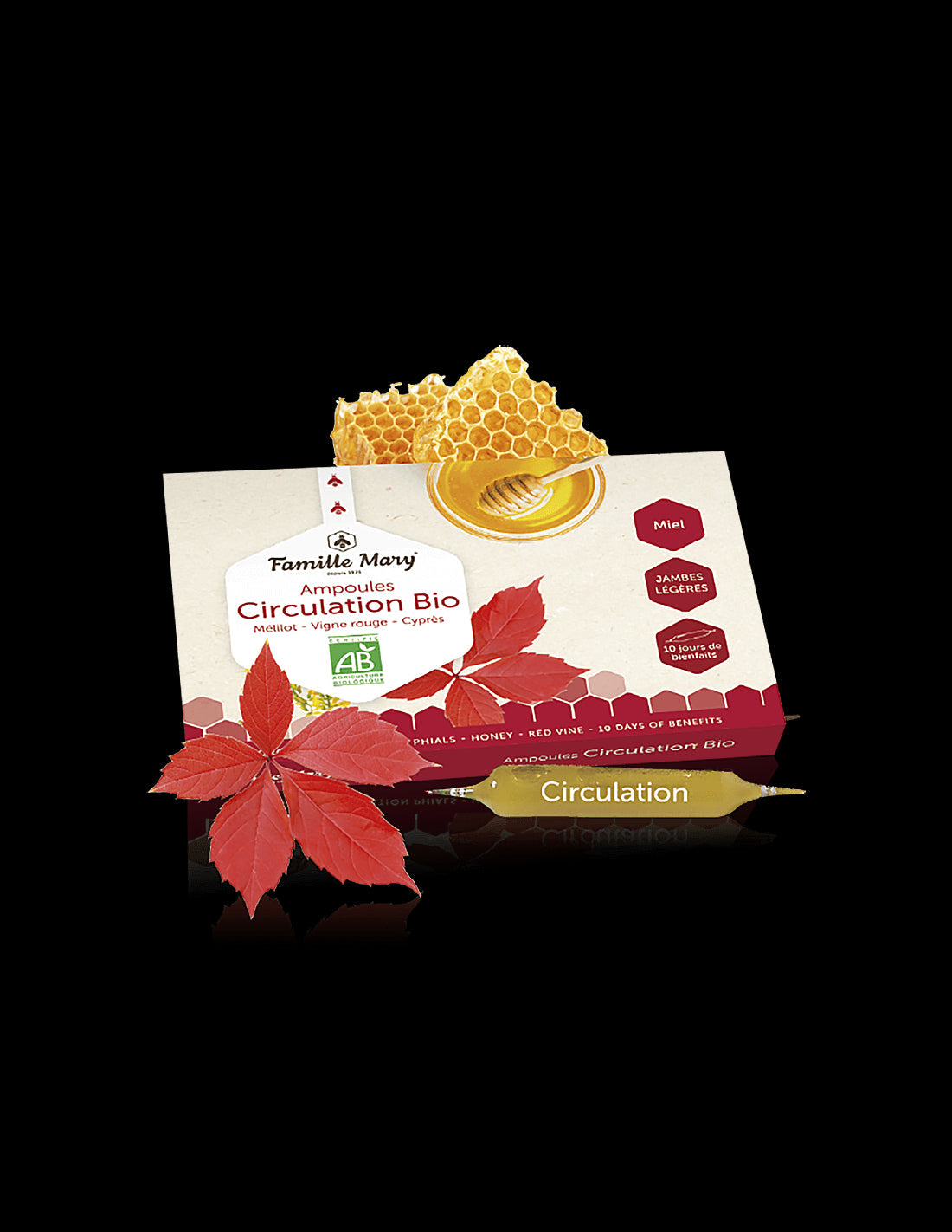 Az Ampoules Circulation Bio a francia Famille Mary nevű, a legmagasabb osztályú természetes méhészeti termékeket gyártó cég terméke. A táplálékkiegészítő javítja a vérkeringést, támogatja a keringési rendszer egészségét, megszünteti a végtagokban a nehézséget és a fáradtságot.