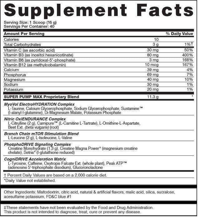 Figyelmeztetés! Olvasd el a teljes cikket Figyelmeztetések mielőtt eldönti, hogy használja-e ezt a terméket, olvassa el a címkén található részt. KOFFEINT TARTALMAZ! A koffeinre vagy más stimulánsokra érzékeny személyeknek a termék használatát meg kell kezdeniük. SuperPump MAX napi 1 (egy) adagolókanálnyi fogyasztásával, hogy felmérjék az egyéni toleranciájukat a termékkel szemben az első edzések során. Semmilyen körülmények között ne vegyenek be 3 (három) adagolókanálnál többet egyszerre!