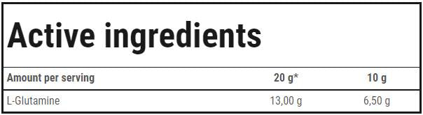 ÖSSZETEVŐK: L-glutamin (65,0%); maltodextrinek; savanyúságot szabályozó anyagok – citromsav, malátasav; sűrítőanyagok – cellulózgumi, xantángumi; aromák; édesítőszer – szukralóz; színezék – azorubin.