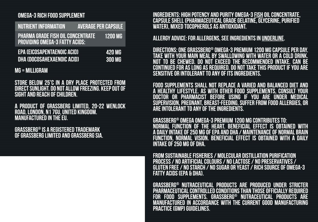 Az EPA és DHA zsírsavak tartalma magasabb, mint a hagyományos omega-3 kiegészítőké. A Grassberg Omega-3 Premium 1200mg lehetővé teszi, hogy naponta csak 3 tablettát vegyen be, mivel a termék egy tabletta 420 mg EPA-t (eikozatapentaénsavat) és 300 mg DHA-t (dokozahexaénsavat) tartalmaz.