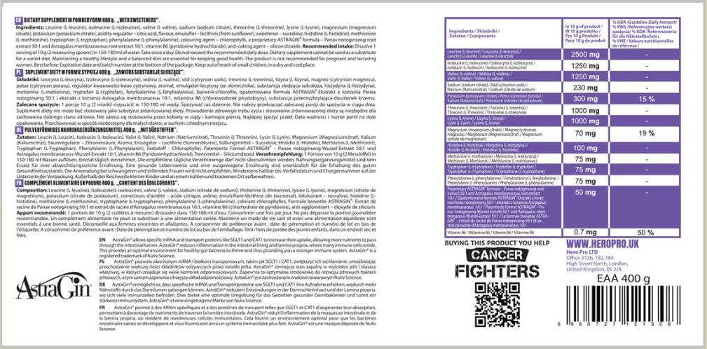 A kiegészítő fogyasztása az izmok regenerálódásának javítását és teljesítményük támogatását célozza. EAA Az aminosavakat a szervezet standard módon táplálékkal juttatja be, de érdemes kiegészíteni őket, különösen intenzív edzés esetén. A termékben található asztragin tovább fokozza a kiegészítők jótékony hatásait.