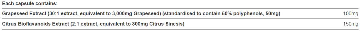 A szőlőmag számos összetevőt tartalmaz polifenolok és flavonoidok Proantocianidinokat is tartalmaznak, amelyek természetesen előforduló bioflavonoidok.