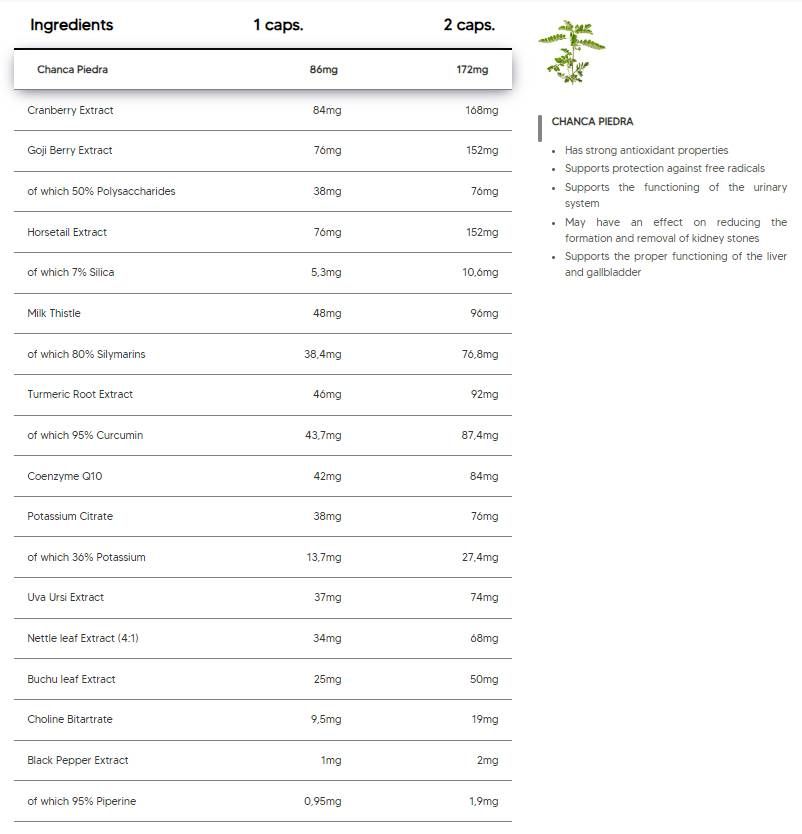 cellulóz, Chanca Piedra kivonat (Phyllantus niruri; 4:1), áfonya kivonat (Vaccinium macrocarpon; 50:1), goji bogyó kivonat (Lycium barbarum; ebből 50% poliszacharidok), zsurló kivonat (Equisetum arvense; ebből 7% szilícium), máriatövisből 0% szilíciumbu, 0% szilícium; kurkuma kivonat (Curcuma Longa; ebből 95% kurkumin), Q10 koenzim (ubiquinol), kálium-citrát (ebből 36% kálium), buchu levél kivonat (Agathosma betulina; 4:1), Uva ursi kivonat (Arctostaphylos uva-ursi), csalánkivonat (Urt.