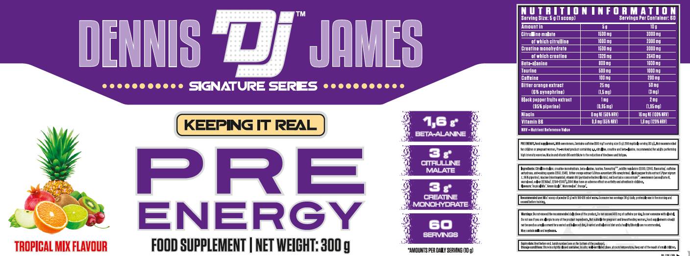 Dennis James Signature Series Energia előtti egy prémium edzés előtti kiegészítő, amelyet úgy terveztek, hogy biztonságosan és hatékonyan növelje az energiaszintet, a koncentrációt és az állóképességet. Ez a tudományosan összeállított keverék olyan hatékony összetevőket tartalmaz, mint a béta-alanin, a koffein és a kreatin, amelyek együttesen növelik az erőt, az állóképességet és a mentális éberséget.