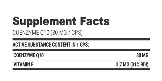 A termék KOENZIM Q 10 - 30 MG A CAPS koenzim Q10-et tartalmaz (30 mg/kapszula). Ez az egyik legfontosabb anyag, amely az állati sejtekben megtalálható, hasonlóan a vitaminokhoz. A koenzim Q10-et részben az emberi szervezet termeli, és bevitelét részben az elfogyasztott táplálék is biztosítja. A koenzim Q10 termelése az életkorral csökken, így a hiány kockázata nagyobb. A koenzim Q10 bevitele fontos azok számára is, akik fizikai megterhelést végeznek, például állóképességi edzést, vagy ha az diétával jár.