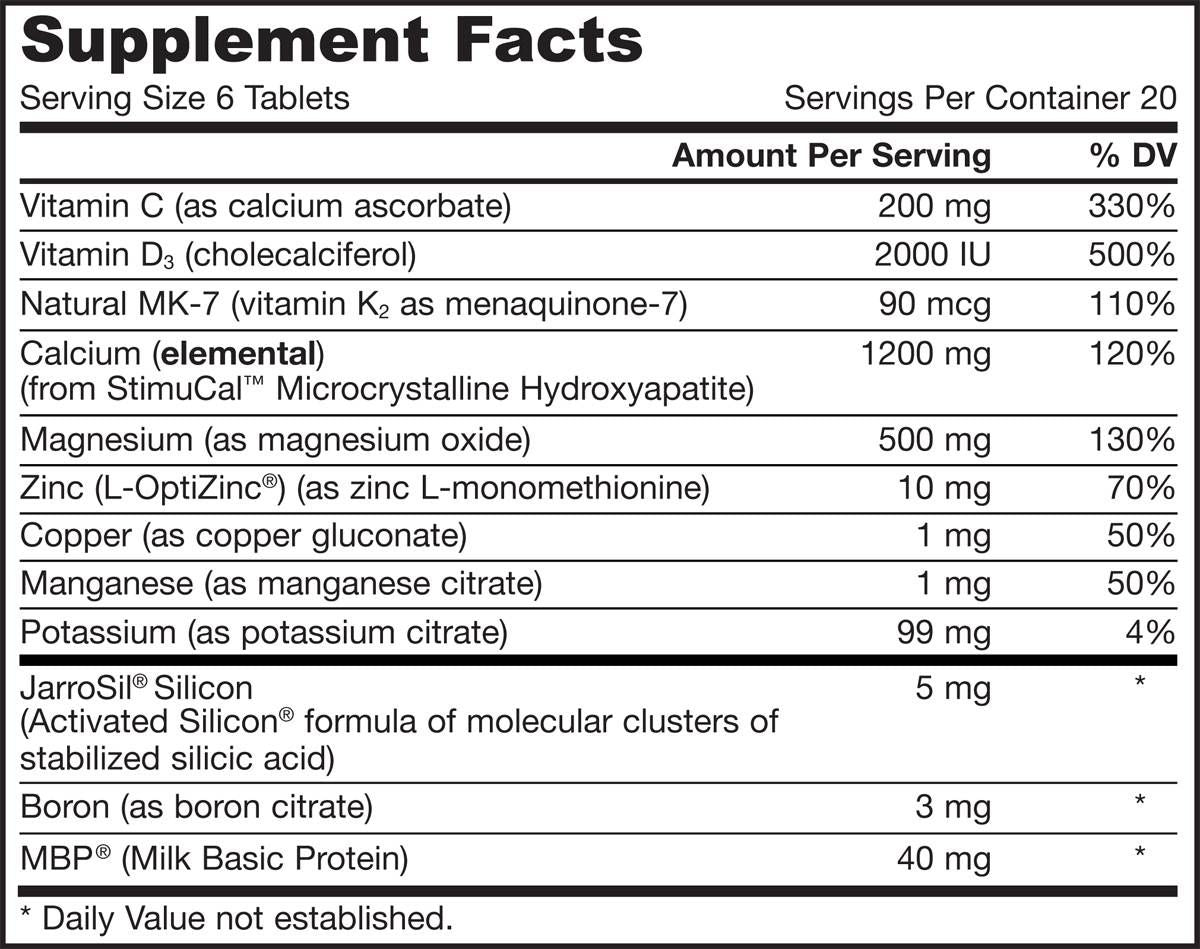 StimuCal™ e kombinírozás s витамин D 3 , витамин К 2 (като МК-7 получен чрез естествен процес на ферментация [по-бионалична форма на витамин К]) и JarroSil® (активиран силикон) за да се подпомагне отлагането на калций в костите, както и за да се насърчи изграто органична матрица. Също така е включен и MBP® (основен млечен протеин), който активира остеобластите и намалява активността на остеокластите.