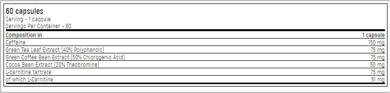 A termék rendkívül erős és hatékony az olyan hatóanyagoknak köszönhetően, mint a guarana, pitypang, afrikai mangó, yerba mate, B3-vitamin, B6-vitamin, fekete bors, koffein, zöld tea kivonat és L-karnitin, amelyek együttesen érik el a kívánt eredményt veszély és mellékhatások nélkül.