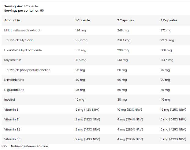 Szójalecitin (71,5 mg) – A szójalecitin a máj egészségére gyakorolt jótékony hatásairól ismert. Számos étrend-kiegészítőben megtalálható, és gyakran használják bizonyos májbetegségek, például az alkoholos májbetegség kezelésére. A szójalecitinben található foszfatidilkolin segít a sérült májsejtek gyógyulásában és helyreállításában, valamint javítja a szerv anyagcsere-folyamatait.