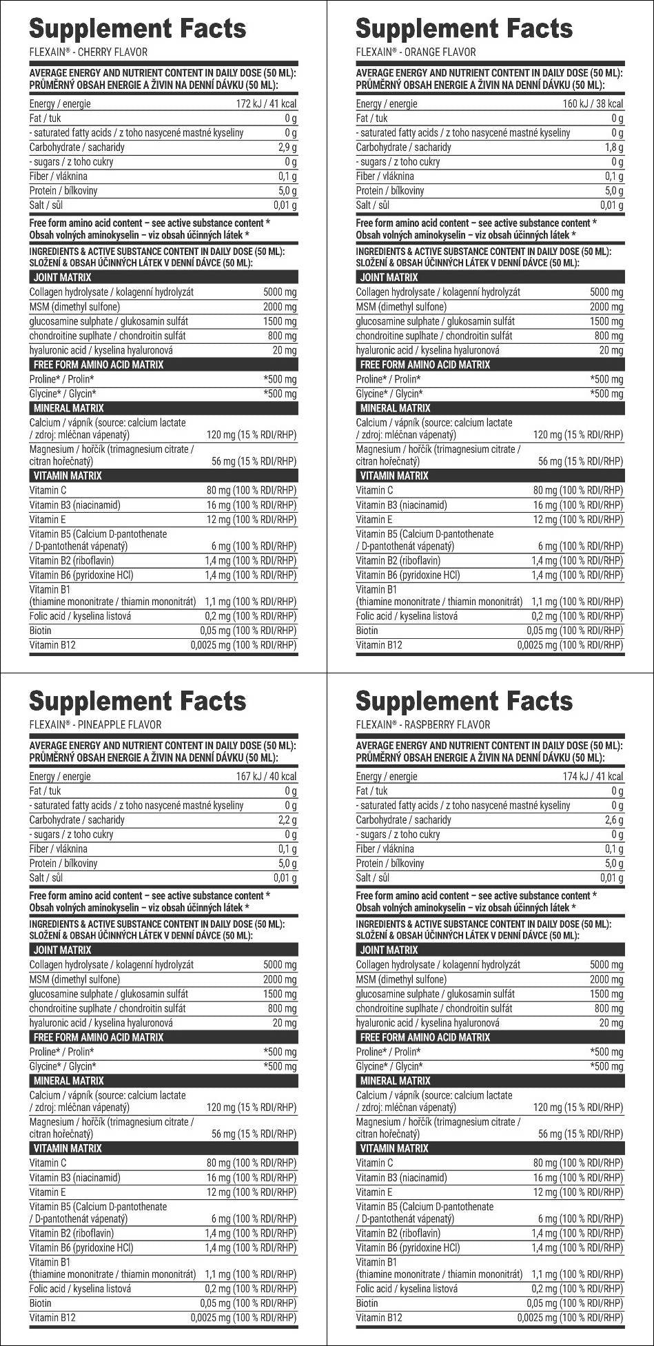 FLEXAIN Az ízületek megfelelő működéséhez elengedhetetlen összes anyag kombinációját tartalmazza: kollagén-hidrolizátum (kollagén peptidek), MSM, kondroitin-szulfát, glükózamin-szulfát, hialuronsav, kalcium és magnézium ásványi anyagok, valamint prolin és glicin szabad aminosavak. Vitamin komplex, amelyből különösen a C-vitamin hozzájárul a kollagén normál képződéséhez, amely az erek, a porcok és a csontok normál működéséhez szükséges.