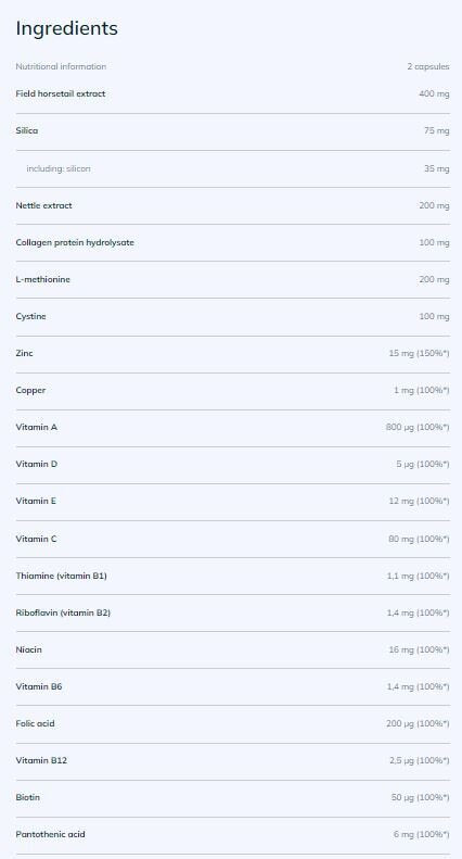 Hozzávalók: zsurlókivonat (Equisetum arvense L.), vitaminok [L-aszkorbinsav – C-vitamin, DL-alfa-tokoferil-acetát – E-vitamin, nikotinamid – niacin, retinil-acetát – A-vitamin, kalcium-D-pantotenát – pantoténsav, cianokobalamin – B12-vitamin, kolekalciferol – D-vitamin, piridoxin-hidroklorid – B6-vitamin, riboflavin – B2-vitamin, tiamin-mononitrát – tiamin (B1-vitamin), pteroilmonoglutaminsav – folsav, D-biotin – biotin], L-metionin (csalánlevél-kivonat, dioica L.), cink-glükonát, cisztin, kollagénfehérje-hidrolizátum, szilícium-dioxid, réz(II)-glükonát, töltőanyag – cellulóz; csomósodást gátló anyag – zsírsavak magnéziumsói; kapszula (zselatin, színezék – E 171)