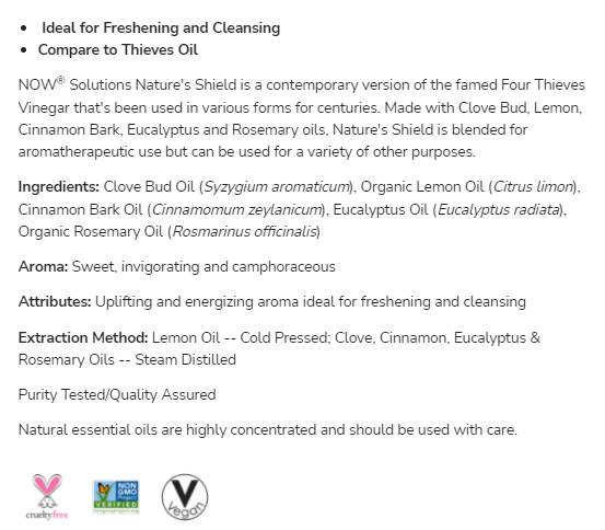 NOW® Solutions Nature's Shield a híres Négy Tolvaj ecet modern változata, amelyet évszázadok óta használnak különféle formákban. A szegfűszeg, citrom, fahéjkéreg, eukaliptusz és rozmaring olajaival készült Nature's Shield aromaterápiás használatra készült, de számos más célra is felhasználható.