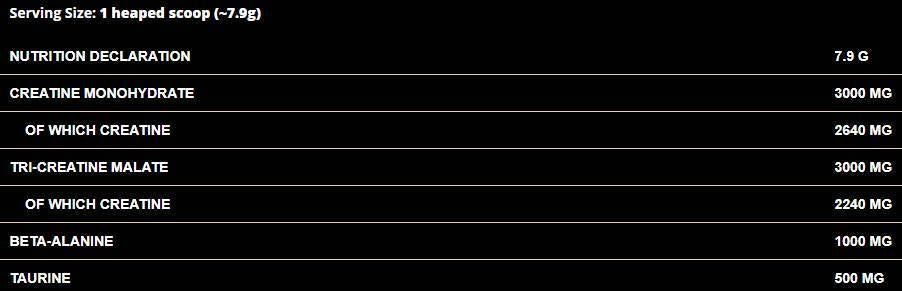 A kreatin-monohidrát a kreatin legbeváltabb formája, amely 100%-ban felszívódik és maximális hatást biztosít. Mikronizációja garantálja a jobb felszívódást a szervezetben. A tri-kreatin-malát felgyorsítja a Krebs-ciklust, növelve az ATP-szintet. A béta-alanin arról ismert, hogy képes növelni a karnozin koncentrációját az izmokban, ami késlelteti a fáradtságot és javítja a teljesítményt edzés közben.