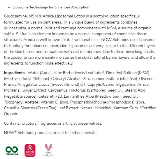 Liposzómás testápoló glükózaminnal, MSM-mel és arnikával egy kifejezetten ízületekre kifejlesztett nyugtató testápoló. Ez az egyedülálló összetevőkombináció a glükózamint, az ízületek és a porcok normál alkotóelemét, az MSM-et, a szerves kén forrását ötvözi. Kén egy olyan elem, amelyről ismert, hogy a kötőszöveti struktúrák normális alkotóeleme. Az árnika hagyományos felhasználásáról ismert. MOST megoldások liposzómás technológiát alkalmaz a fokozott felszívódás érdekében. A liposzómák szorosan hasonlítanak a bőrbarrier különböző rétegeire, és kompatibilisek a sejtmembránokkal. Utánzó képességüknek köszönhetően a liposzómák könnyebben hidratálják a bőr természetes barrier rétegeit, és lehetővé teszik az összetevők hatékonyabb működését.