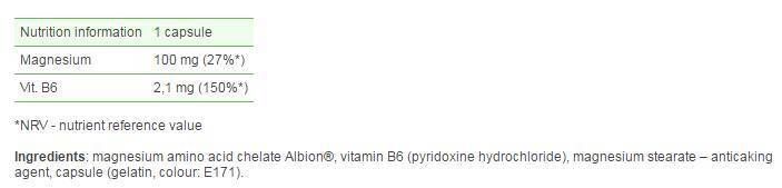 Kapszula alakú étrend-kiegészítő, amely a magnézium könnyen felszívódó formáját tartalmazza – Albion® magnézium-aminosav-kelát (magnézium-biszglicinát), B6-vitaminnal dúsítva.