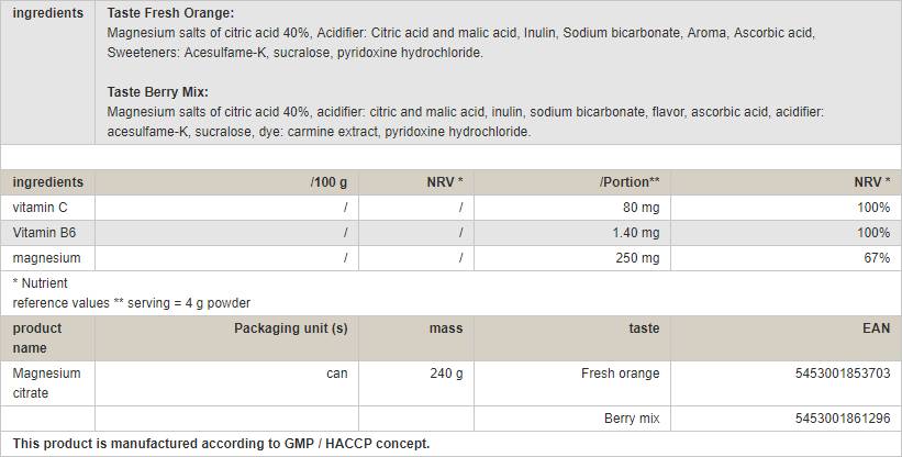 Magnézium (magnézium-citrát) támogatja a csontnövekedést, és több mint 300 enzimreakcióhoz, valamint a sejten belüli energiatermeléshez szükséges. Magnézium (magnézium-citrát) pozitív hatással van a reproduktív rendszer állapotára az erek tágításával. Csökkenti a vérnyomást és elősegíti a hörgők tágulatát légzőszervi betegségek esetén. Az aktív fizikai és mentális stressz jelentősen növeli a szervezet vitamin- és vitaminigényét. Magnézium (magnézium-citrát).
