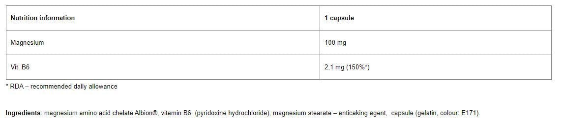 Stresszoldó étrend-kiegészítő, melynek hatóanyagai védik az idegrendszert és fokozzák a libidót. Magnézium, cink és... B6-vitamin támogatja a szervezet regenerációs folyamatait, csökkenti a fájdalmat és a görcsöket, valamint növeli a koncentrációt.
