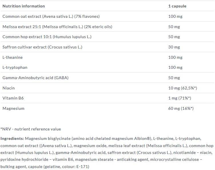 Hozzávalók: Magnézium-biszglicinát (aminosav kelátkötésű magnézium Albion®), L-teanin, L-triptofán, zabkivonat ((Avena Sativa L.), magnézium-oxid, citromfű levélkivonat (Melissa Officinalis L.), komlókivonat (Hops vulgaris L.), gamma-aminovajsav, sáfránykivonat (Crocus sativus L.), nikotamid - niacin, piridoxin-hidroklorid - B6-vitamin, magnézium-sztearát - csomósodást gátló anyag, mikrokristályos cellulóz - töltőanyag, kapszula (zselatin, színezék: E-171)