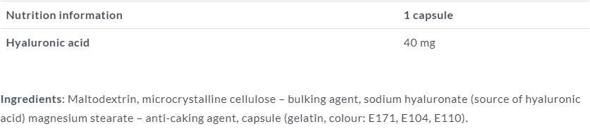 Ez egy egyedülálló, innovatív étrend-kiegészítő, amely hialuronsavval látja el étrendjét – a kötőszövet szerkezeti és funkcionális összetevőjével, amely biztosítja annak megfelelő hidratáltságát és mechanikai ellenállását. Természetes biopolimer tulajdonságaival rendelkezik, és szükséges összetevője a bőr extracelluláris mátrixának felépítéséhez, így a bőr sima, egészséges, rugalmas és vonzó megjelenésű lesz. Ezenkívül a hialuronsav alkotja az ízületi porc szerkezeti vázát, így ellenállóvá teszi a deformációval szemben.