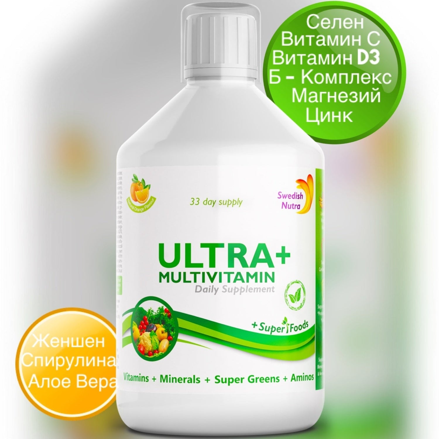 A folyékony Ultra+ vitaminok folyékonyak és könnyen bevehetők. Van egy kis ízük.sanNarancs ízű. Egy 500 ml-es üveg 33 napra elegendő. Rendkívül gazdag formula, amely nagy dózisú vitaminokkal, ásványi anyagokkal és szuperélelmiszerek keverékével látja el a szervezetet.