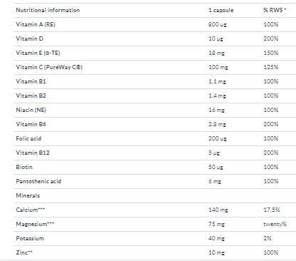 Hozzávalók: A-vitamin, D-vitamin, E-vitamin, C-vitamin, B1-vitamin, B2-vitamin, niacin, B6-vitamin, folsav, B12-vitamin, biotin, pantoténsav, kalcium (Albion® aminosav-kelát, kalcium-karbonát), magnézium (Albion® aminosav-kelát, magnézium-oxid, kálium, cink (Albion® aminosav-kelát), vas (Albion® aminosav-kelát (Ferrochel®)), mangán (Albion® aminosav-kelát), réz (Albion® aminosav-kelát), jód, szelén, koreai panax ginseng kivonat (Panax ginseng L.), amelyből 7% ginzenozid, lutein, hialuronsav