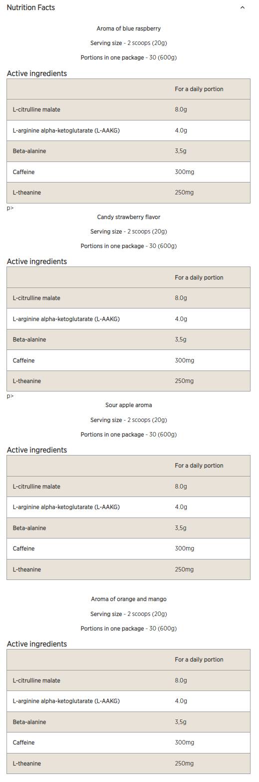Ezenkívül számos jól ismert és jól kutatott összetevőt adtunk hozzá, beleértve a 8 mg citrullin-malátot, a 3,5 g béta-alanint, a 4 g L-arginin-alfa-ketoglutarátot és végül a 250 mg L-teanint.
