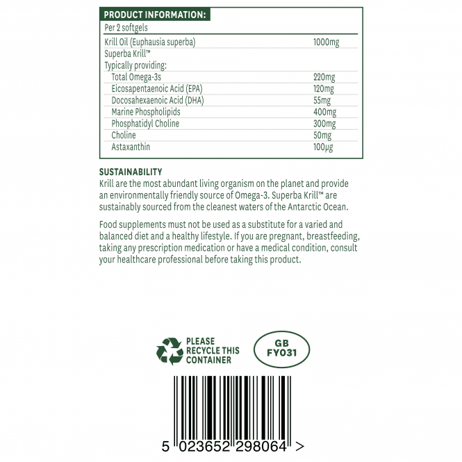 Natures Aid Antarktiszi krillolaj Superba Az Antarktiszi-óceán legtisztább vizeiből származó zooplanktonból vonják ki, és a Brit Fenntartható Tengeri Medence Fejlesztési Tanács tanúsította. Íztelen, szagtalan és könnyen lenyelhető lágyzselatin kapszulák. A krill olaj kiváló omega-3 zsírsavforrás, beleértve az EPA-t és a DHA-t. Jellemzője a magas foszfolipid-koncentráció, ami megkönnyíti a szervezet számára a felhasználását, kevesebb, mint a halolajban, mivel általában a halolajban található omega-3 zsírsavak trigliceridek formájában tárolódnak. A krill olaj foszfatidilkolint és asztaxantint tartalmaz. A foszfatidilkolin az emberi szervezet fő foszfolipidje, a sejtmembránok építőköve. Számos folyamatban vesz részt a szervezetben, például a zsírok májból a véráramba történő szállításában. Támogatja a máj állapotát és funkcióit. Az asztaxantin egy természetes karotinoid, amely egyedi szerkezetének köszönhetően széles körű antioxidáns előnyöket biztosít. Mivel az asztaxantin képes átjutni a vér-agy és a vér-retina gáton, hatékony antioxidáns védelmet nyújthat közvetlenül a szemnek, az agynak és az idegrendszernek. Az omega-3 zsírsavak gyulladáscsökkentő tulajdonságai védelmet nyújtanak a szív- és érrendszeri betegségek, a rák és a 2-es típusú cukorbetegség ellen. Javítják a vérkeringést a szervezetben, csökkentik a rossz koleszterinszintet és a vérnyomást, valamint támogatják az ízületek egészségét.