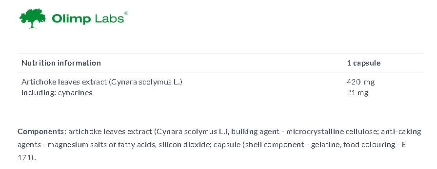 Hozzávalók: articsóka levélkivonat (Cynara scolymus L.), töltőanyag - mikrokristályos cellulóz; csomósodást gátló anyagok - zsírsavak magnéziumsói, szilícium-dioxid; kapszula (kapszula - zselatin, ételszínezék - E 171).