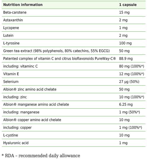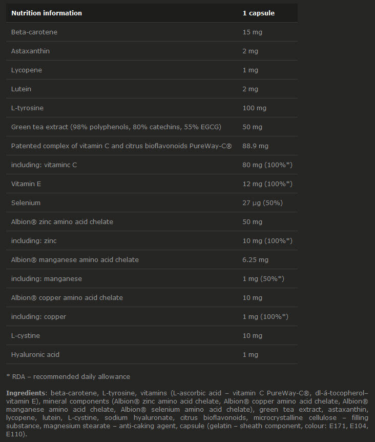 Antiox – bőrvédő keverék egy olyan anyagkomplexum, amely nagyon fontos a napozás mellékhatásainak leküzdésében. A melanin és a gyönyörű szín mellett hatalmas mennyiségű szabad gyök keletkezik napozás közben. Ezek romboló hatással vannak a bőr szerkezetére és működésére, és ami még rosszabb, a bőr idő előtti öregedését okozzák, és számos bőrbetegséghez vezethetnek. A magas koncentrációjú zöld tea kivonat aktív polifenoljai, különösen a katechinek, az EGCG hihetetlenül hatékonyak a szabad gyökök ellen és védik a bőrt. Hatásaikat kiegészíti a PureWay – C (C-vitamin) Ez több mint egy nagyon erős antioxidáns. A tudósok megállapították, hogy nagyon hatékonyan felgyorsítja a bőr regenerálódási folyamatait. Az E-vitamin kiegészíti a C-vitamint, erős antioxidáns, és javítja a melanin szintézisét napozás közben. A termék a legerősebb antioxidáns ásványi anyagokat is tartalmazza a legjobb biológiailag hasznosuló formájukban.