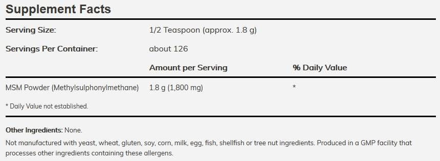 MSM (metilszulfonilmetán) Fontos szerepet játszik az aminosav- és kollagénszintézis folyamatában. A kén az egyik esszenciális ásványi anyag, amely kulcsszerepet játszik a szervezetünkben. Ideális azok számára, akik értékelik bőrük, körmük és hajuk egészséges megjelenését.