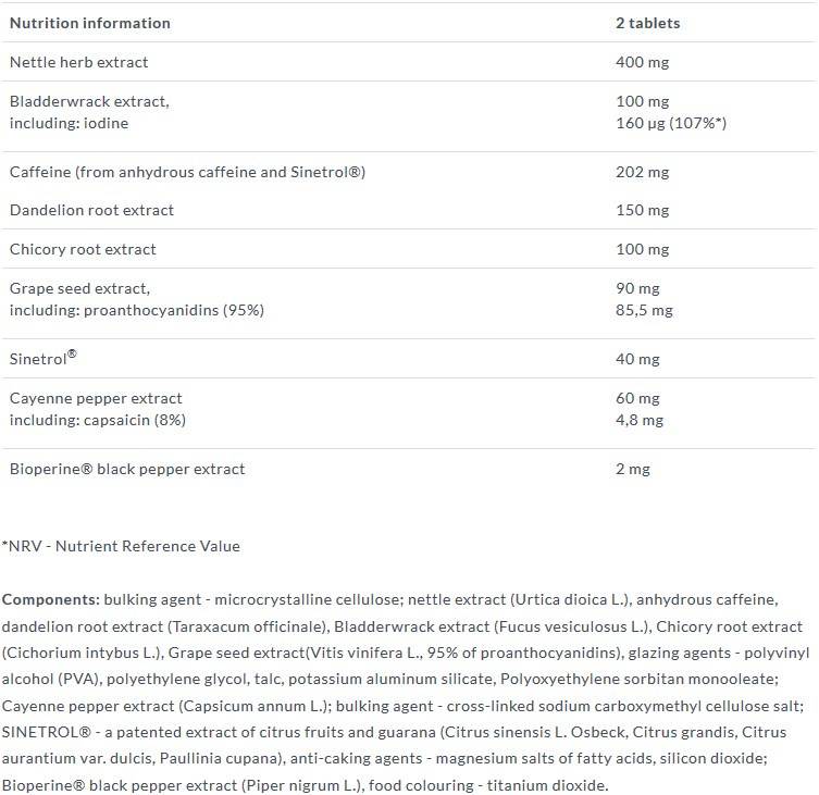 Cayenne-bors - segít a zsírégetésben, segít a cellulit elleni küzdelemben. Pitypang, csalán, cikória - elősegítik a víz eltávolítását a szervezetből, fokozzák az anyagcserét és segítenek a méregtelenítésben, valamint serkentik az emésztést.