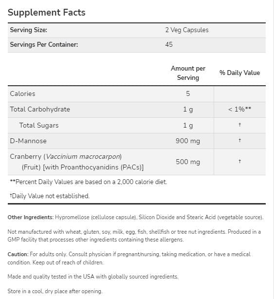 Figyelmeztetések: Nem ajánlott áfonyára vagy mannózra ismert allergiában szenvedőknek. A termék szedése előtt konzultáljon egészségügyi szakemberrel, különösen, ha terhes, szoptat, vagy valamilyen meglévő egészségügyi problémája van.