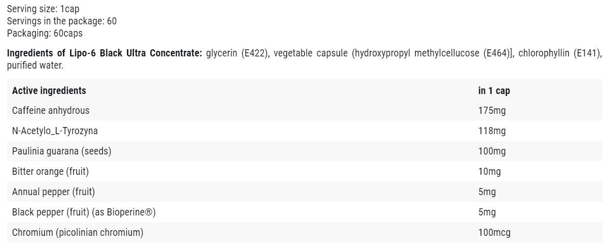 Egy kapszula Lipo-6 Black Ultra koncentrátum tartalmaz 200 mg koffein .