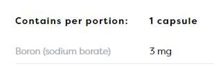 Bór 3 mg biztonságos adag elemet tartalmaz, így érezheti a kiegészítők jótékony hatásait. Egy kapszula megfelel a bór ajánlott napi adagjának - 3 mg. A termék nátrium formájában van borát (bórax) - ebben a formában felszívódik a belekben. Főként a vizelettel ürül ki.