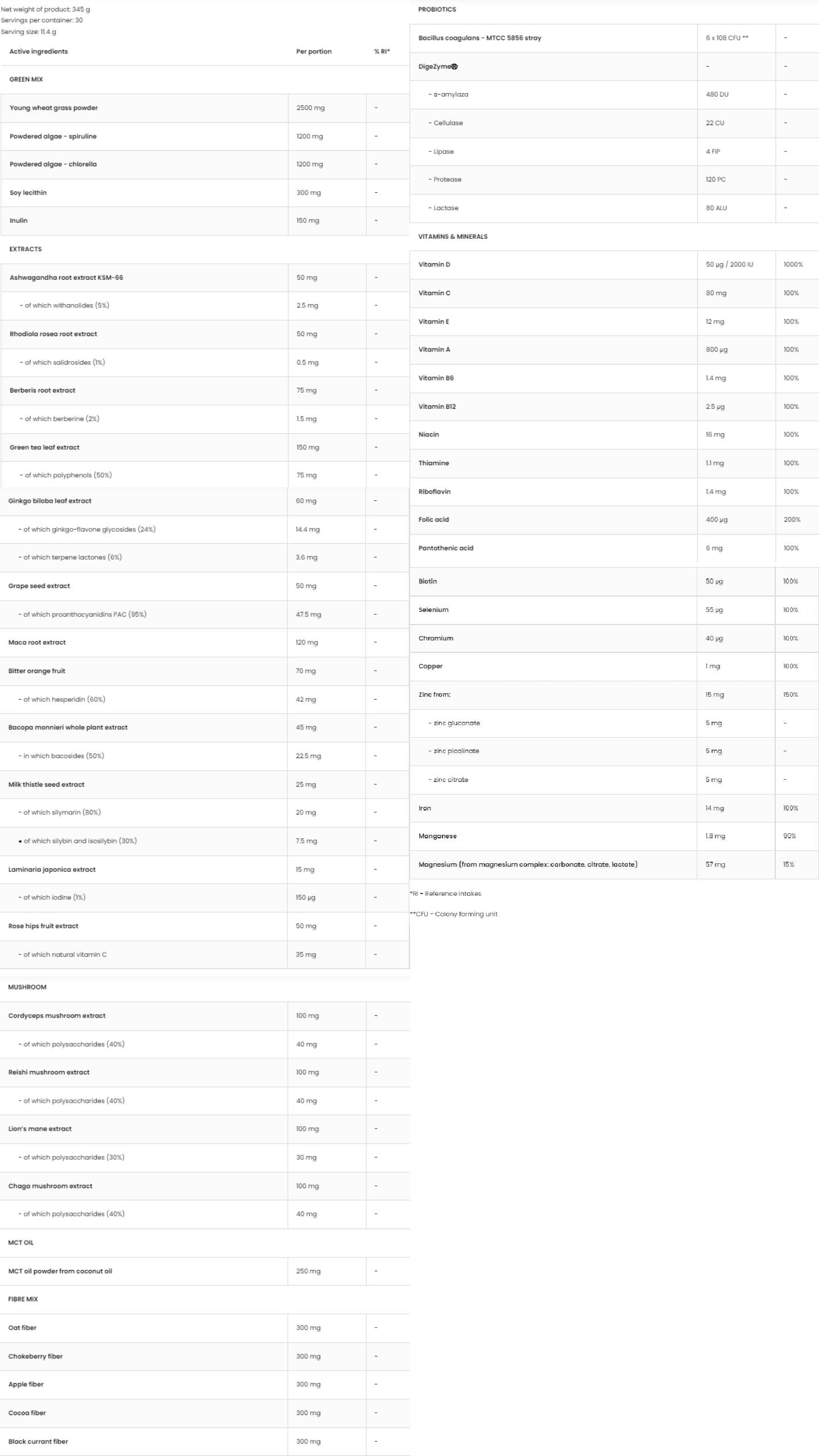 Figyelmeztetések: A termék nem helyettesíti a változatos étrendet. 12 év alatti gyermekek, terhes vagy szoptató nők számára orvosi konzultáció nélkül nem ajánlott. Ha bármilyen egészségügyi problémája van, vagy gyógyszert szed, használat előtt konzultáljon orvosával.