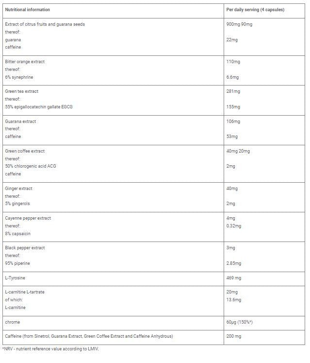 Hozzávalók: 900 mg SINETROL® XPur szabadalmaztatott kivonat, 1433 mg Thermo Blend, amelyből: zöld kávé kivonat (50% ACG), gyömbér gyökér kivonat (5% gingerol), chili paprika kivonat (8% kapszaicin), fekete bors kivonat (95% piperin). ), L-tirozin, L-karnitin, 333 mg keserűnarancs kivonat 6%, 281 mg zöld tea kivonat (55% EGCG), 241 mg guarana kivonat (22% koffein), 240 mg koffein, 150 µg króm, töltőanyag – mikrokristályos cellulóz, csomósodást gátló anyag – magnézium-sztearát, kapszula (zselatin, színezék: E171)