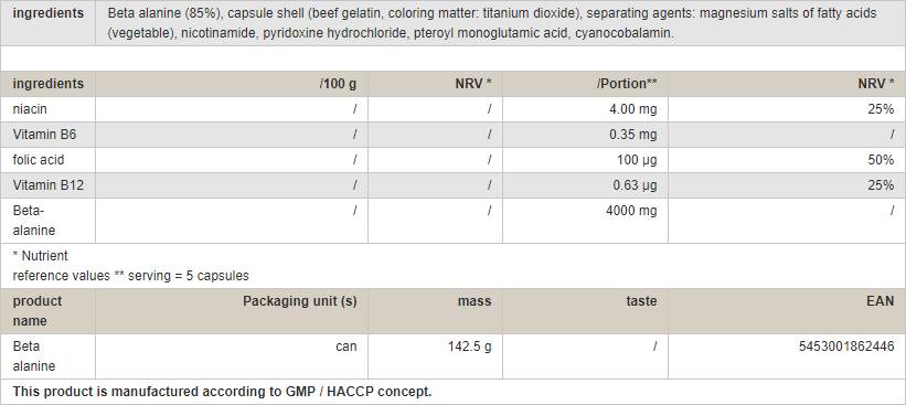 Használati utasítás: Béta-alanin - 5 kapszula, egyenletesen elosztva a nap folyamán folyadékkal bevéve.