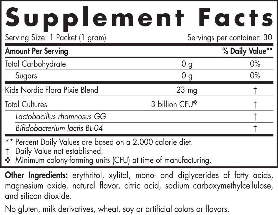 A Nordic Flora Kids Probiotic Pixies | 3 Billion Active Cells egy élvezetesen fogyasztható, bogyós ízű probiotikus por az emésztőrendszer, az immunrendszer és a légzőszervek egészségére.