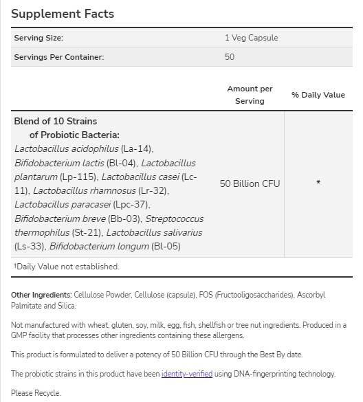 A Probiotic-10 50 Billion egy hatékony készítmény, amely 10 különböző probiotikumtörzset kombinál, adagonként 50 milliárd aktív probiotikus kultúrát biztosítva. Ezek a probiotikumok kulcsszerepet játszanak az egészséges bélflóra fenntartásában, ami elengedhetetlen az emésztőrendszerünk normális működéséhez.