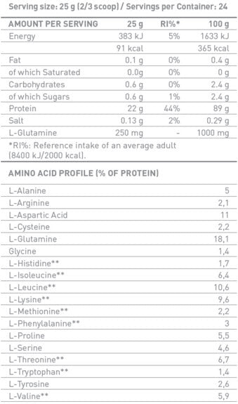 Ez a termék adagonként 21 gramm fehérjét tartalmaz, ami több mint elegendő az izomtömeg fenntartásához és a katabolikus folyamatok megelőzéséhez. A hozzáadott L-glutamin kulcsszerepet játszik az izmok lebomlásával szembeni védelmében és a növekedési hormon szintézisének serkentésében.